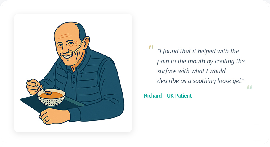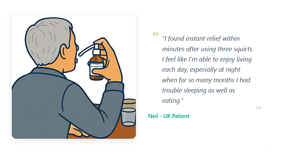 Mucosamin Mouthwash and Spray both contain a unique formulation of hyaluronic acid and amino acids, which attracts and holds moisture whilst forming a protective barrier that helps damaged oral tissue to heal.